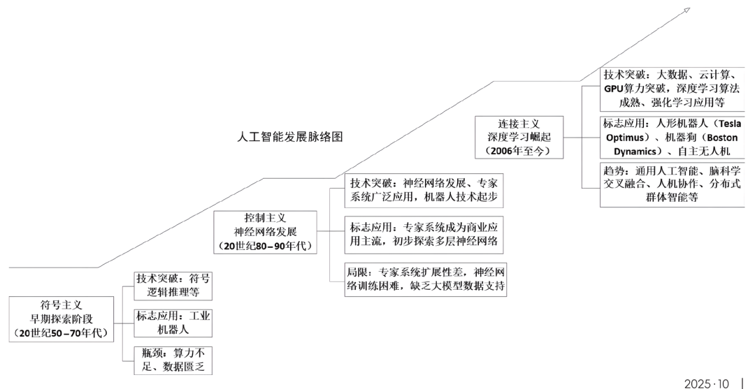 自1956年达特茅斯会议上“人工智能”诞生以来,其发展历经三次浪潮,发展脉络图如图1所示。第一次浪潮(20世纪50—70年代)以符号主义为主导,依托数理逻辑构建专家系统;第二次浪潮(20世纪80—90年代)转向控制主义,专家系统得以广泛应用,逐步探索神经网络雏形;第三次浪潮(2006年至今)连接主义占据主导地位,以深度学习为支柱,形成“数据驱动+端到端学习”的新范式。当前人工智能技术已进入多维突破与场景深化的关键阶段,以Transformer架构为核心的生成式人工智能系统展现出强大的跨模态推理能力;多模态模型如Sora大模型则重构了数字内容生产范式;具身智能领域机器人通过视觉-运动联合建模实现复杂操作。