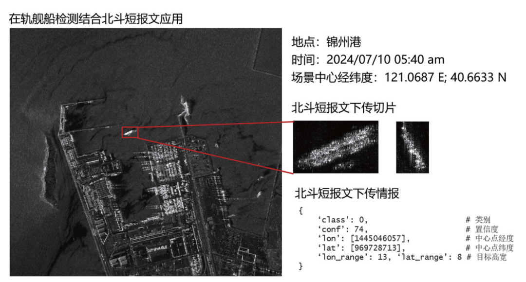 2022年2月27日,搭载天仪研究院巢湖一号SAR遥感卫星发射的21TOPS智能计算载荷,截至2024年8月已完成428次在轨AI计算任务,成功率100%,并通过上注更新链路(OTA)实现星上处理平台在轨重构,完成星载SAR舰船目标识别算法更新,并新增常态化定期重访观测等功能,星上处理能力不断提升。SAR在轨处理实例如图4所示。