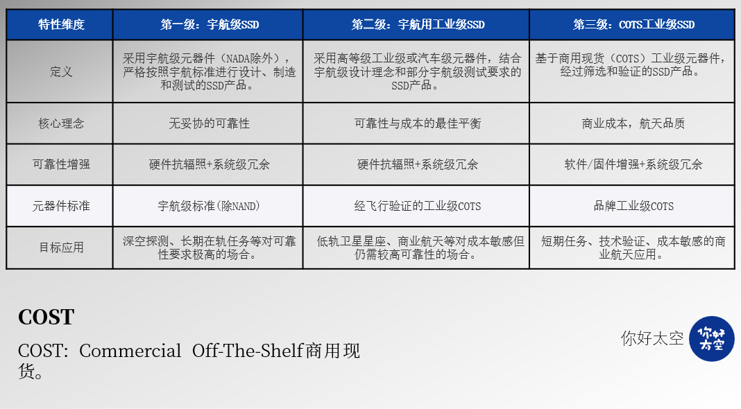 本期作者为艾可萨科技创始人朱荣臻,为大家分享:《宇航存储新纪元:关于“宇航级”SSD的三级体系思考》。随着全球进入以商业化和规模化为特征的“新航天”时代,从低轨卫星星座的爆发式增长,到国家主导的深空探测任务,对数据存储的需求正变得空前复杂。然而,在航天存储领域的发展过程中,一个现象始终困扰着整个行业:对于“宇航级”标准的定义模糊,特别是针对SSD这类复杂模组,缺乏统一的鉴定规范。这种标准的缺失,不仅制约了技术的健康发展,也可能导致市场出现“劣币驱逐良币”的乱象。因此,现在是时候正本清源,推动行业共识了。本文基于航天存储领域的技术积淀与在轨实践,对宇航级SSD的现状、挑战以及未来发展路径进行系统性思考。(一)“宇航级”的真正含义