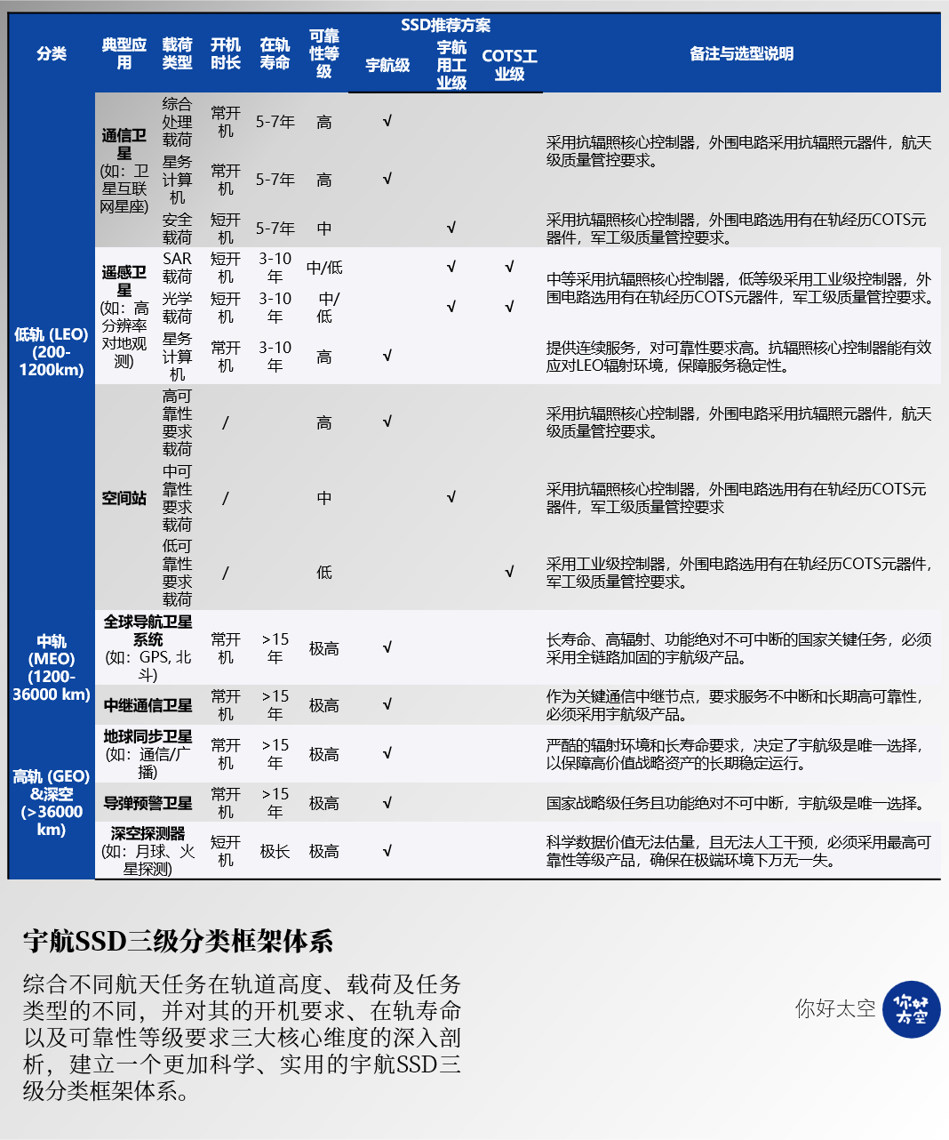 在系统层面,需要构建从物理失效到应用访问的完整容错体系,确保在极端情况下数据不丢失、服务不中断,包含加固IP与块设备驱动等,强化SSD访问可靠性;通过Smart RAID、HRFS技术来打破IO Stack层级界限,屏蔽Die/Plane/坏块故障,实现负载均衡通过分布式存储网络降低硬件可靠性依赖,最终达成 “全COTS器件适配航天存储” 目标。不同航天的任务在可靠性、寿命、成本等方面有着差异化需求,我们可以构建⼀个多维解析模型,综合不同航天任务在轨道高度、载荷及任务类型的不同,并对其的开机要求、在轨寿命以及可靠性等级要求三大核心维度的深入剖析,建立一个更加科学、实用的宇航SSD三级分类框架体系,并为不同航天任务来精准匹配最合适的存储解决方案。根据影响不同航天任务以及对于SSD的需求,建立的三级SSD分类如下:面对宇航存储技术的快速发展和市场需求的日益多样化,建立统一、科学的宇航级SSD评价体系已成为行业发展的迫切需要。这需要产业链各方的共同努力:(一)标准制定机构的作用相关标准制定机构应当加快制定针对宇航级SSD的专门标准,明确技术指标、测试方法和认证流程。这些标准应当既体现宇航级产品的严苛要求,又考虑到技术发展的现实情况和成本控制的需要。(二)产业链协同发展从NAND Flash供应商到SSD制造商,从测试设备厂商到最终用户,产业链各环节都应当积极参与标准的制定和实施。只有形成产业链的协同效应,才能真正推动宇航级SSD技术的健康发展。(三)技术创新与标准化并重在推进标准化的同时,也要鼓励技术创新。标准应当为技术发展留出足够的空间,避免过于僵化的规定阻碍技术进步。宇航存储技术正站在一个重要的历史节点上。新航天时代的到来为行业带来了前所未有的机遇,同时也提出了更高的挑战。建立科学、统一的宇航级SSD评价体系,不仅是技术发展的需要,更是行业健康发展的基石。通过构建三级分类体系,可以在满足不同应用场景需求的同时,为用户提供清晰的选择依据。这种分类方式既体现了对传统宇航级标准的尊重,又适应了新航天时代多样化的应用需求。期待产业链各方能够携手合作,共同推动宇航级SSD评价体系的建立和完善。只有通过科学的定义、透明的沟通和持续的创新,才能确保宇航存储技术在未来的发展中行稳致远,为人类的太空探索事业提供更加可靠的技术支撑。朱荣臻,工学博士,计算机体系结构方向,师从沈绪榜院士,现任艾可萨科技(成都)有限公司董事长及总经理,是我国首颗宇航级存储控制器芯片及新一代航天数据存储系统架构设计师,曾在美国LSI,Intel,SST、兆易创新等公司任职,有丰富的航天存储相关工作经验。