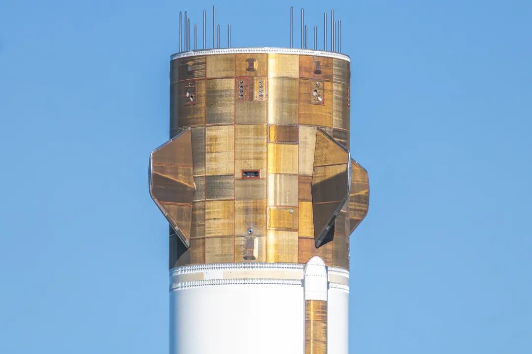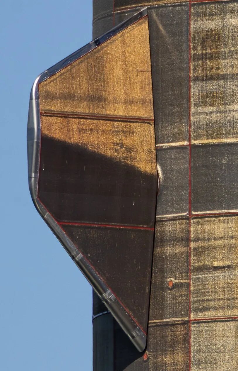 ●Comet TPS新格伦助推器从上到下,包括前穹顶及上部筒段、4片气动控制舵面、两条纵向稳定翼、液甲烷贮箱下部筒段、后部模块外层,都被覆盖着块状、面板状的金黄色材料——这就是Comet TPS。这是一种柔性织物状绝热材料,由陶瓷纤维(如硅酸盐陶瓷)与高性能聚合物(如聚酰亚胺,类似于杜邦公司研发的高性能聚酰亚胺薄膜Kapton)复合而成,外层带有金属化涂层,通常是铝化处理或反射性涂层,使其呈现金黄色、铜色或棕金色光泽。这套Comet TPS在连续多次飞行后,会从亮金变成古铜、棕色或出现虹彩——这是高温氧化与热循环造成的正常老化色。根据蓝色起源的专利描述(US20190345896A1),该系统可能整合水饱和机制,利用水的汽化热(约2260 kJ/kg)增强冷却效果,进一步提升热防护性能。不同于星舰的刚性热防护系统,新格伦Comet TPS强调柔性和轻量化,便于覆盖火箭的复杂曲面(如4片气动控制舵面和两条纵向稳定翼),安装与维修更简便。这体现了蓝色起源的渐进式可重复使用设计理念:在中等再入热环境下优先追求稳定、轻量和经济性,而非去硬刚轨道级极端热负荷。