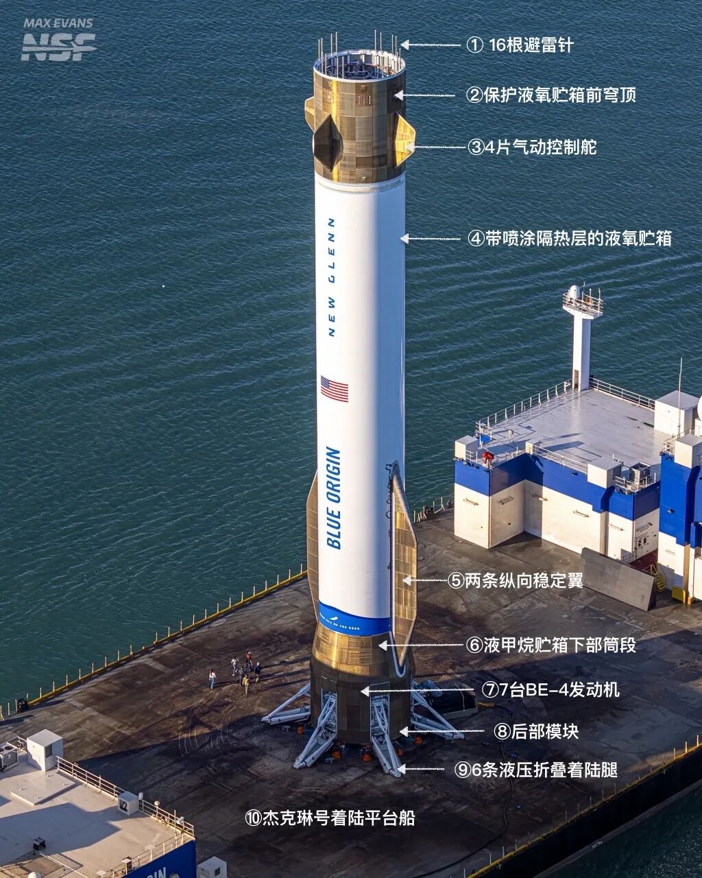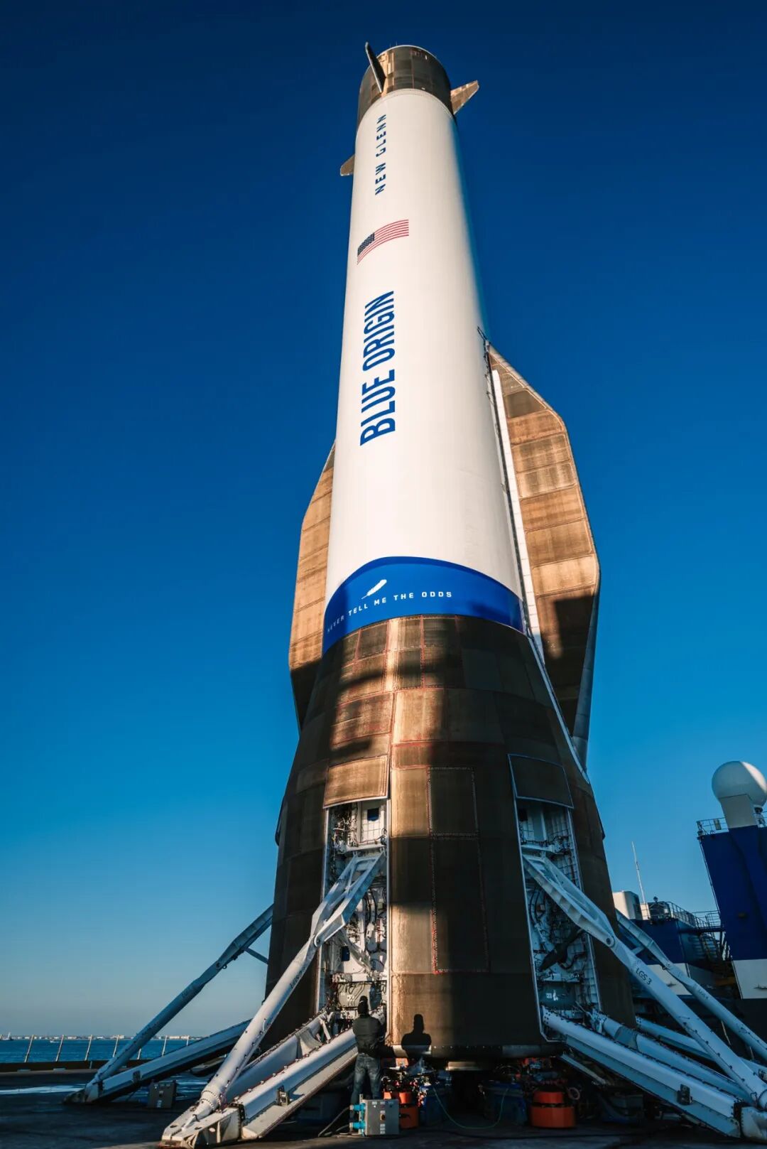 2025年11月18日,佛罗里达州卡纳维拉尔港迎来历史性一幕:蓝色起源新格伦火箭的第一级助推器矗立在专属回收船杰克琳号上安全返港。这枚高57米、直径7米的助推器,名为「Never Tell Me the Odds」(别告诉我概率),源自《星球大战》中汉·索罗的经典台词。这枚助推器于11月13日从佛州卡角36号发射场升空,执行新格伦的第二次飞行任务(NG-2),成功将NASA的ESCAPADE双火星探测器送入预定轨道,这是新格伦首次携带客户有效载荷并实现第一级助推器海上着陆和完整回收的双里程碑——此前2025年1月16日的首飞虽成功入轨,但助推器因引擎重启故障未能回收。返港时真正吸引围观者目光的,不是火箭体量,而是几处金黄色或铜色皮肤——那不是什么太空黄金外壳,而是蓝色起源自主研发的 Comet TPS(彗星热防护系统),确保助推器在大气再入时免受高温摧毁。