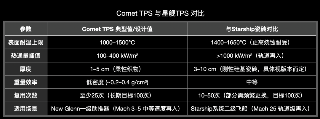Comet TPS与星舰隔热片对比▼:(注:Blue Origin未公开Comet完整规格,以上基于专利、蓝色起源公开信息、CEO公开声明以及独家信源)