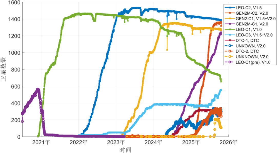 2022年内,基本完成LEO-C2星座部署,在轨持续稳定运行2年时间,自2025年起该星座内卫星减少,呈现退役趋势。