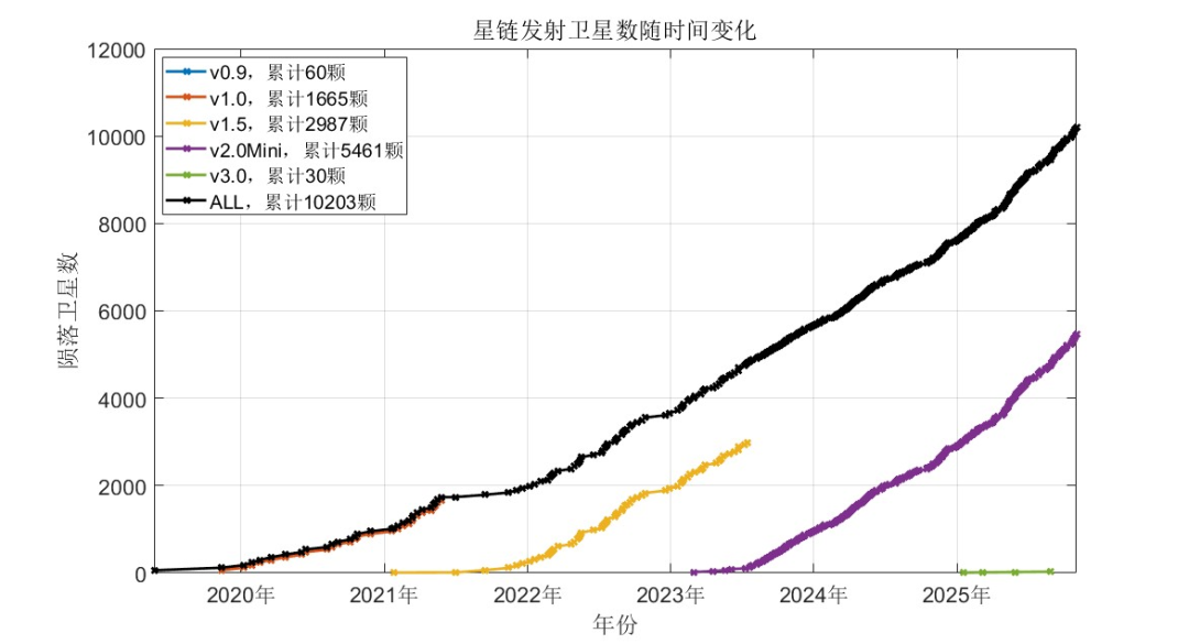 截至2025年11月1日,SpaceX公司已累计发射星链卫星10203颗,占自1957年全球所有发射卫星数量(约2.2万颗)的45%,是人类历史上首次发射卫星数破万的“巨星座”系统。依托自研的天智巨星座研究平台,对星链发展历程、星座部署过程以及在轨分布情况进行了详细分析。总结如下:卫星版本升级过程,呈现每两年一次大的版本升级;卫星多星座部署过程,呈现阶段部署重点等规律;7908颗在轨卫星主要分布在10个星座(“235”=2个手机直连星座+3个二代星座+5个一期星座)。 自2019年5月星链卫星V0.9版本首次批量发射以来,已经历多个版本的升级迭代,大致划分为如下几个阶段:各版本卫星发射数随时间变化如下:图1 不同版本星链卫星发射数随时间变化