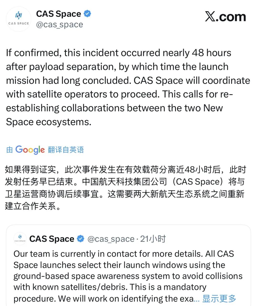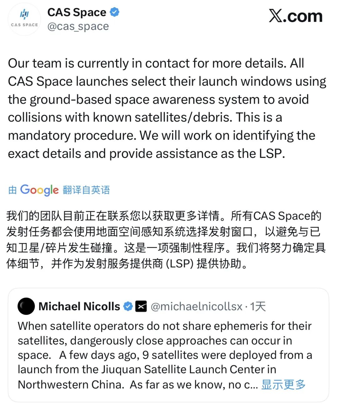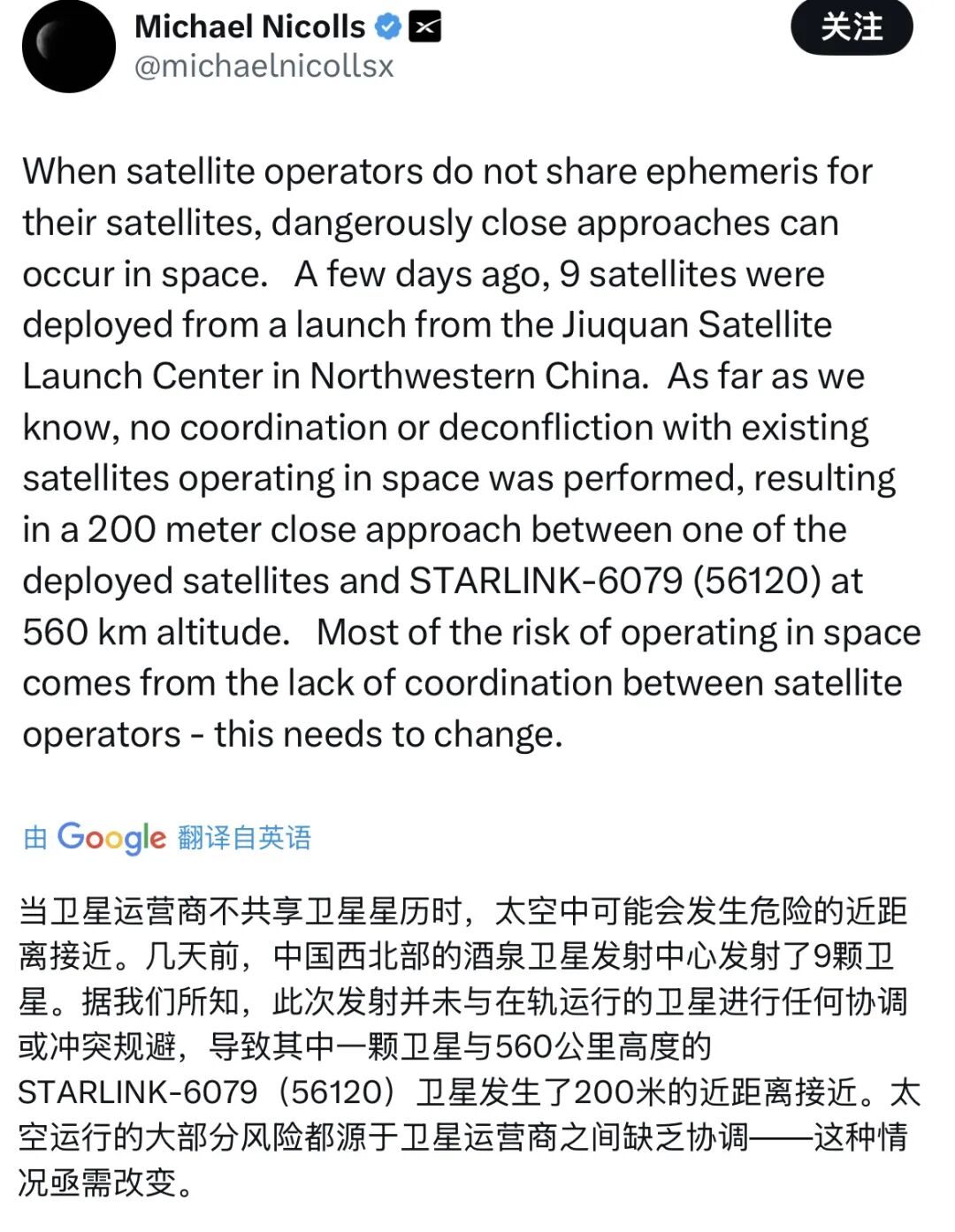 近日,来自太空探索技术公司星链工程副总裁Michael Nicolls于12月13日发布了在X发布了一条信息,几天前,中国西北部的酒泉卫星发射中心发射了9颗卫星。其中一颗卫星与560公里高度的STARLINK-6079(56120)卫星发生了200米的近距离接近。随后中科宇航回应道团队目前正在联系Michael Nicolls以获取更多详情信息。在昨日下午中科宇航(CAS Space)回复到:如果得到证实,此次事件发生在有效载荷分离近48小时后,此时发射任务早已结束。中科宇航将与卫星运营商协调后续事宜。