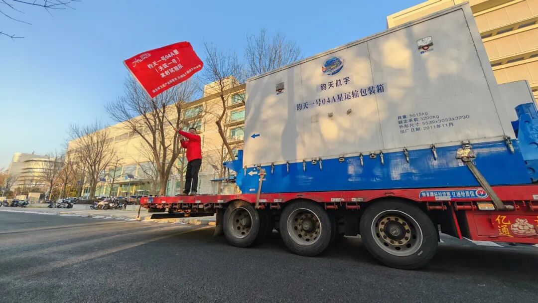 在出征仪式上,发射试验队队长张辰阳代表队员作出征宣誓,常正勇向发射试验队授予出征战旗。全体与会人员共同目送钧天一号04A星(天筑一号)转运车辆启程出征。