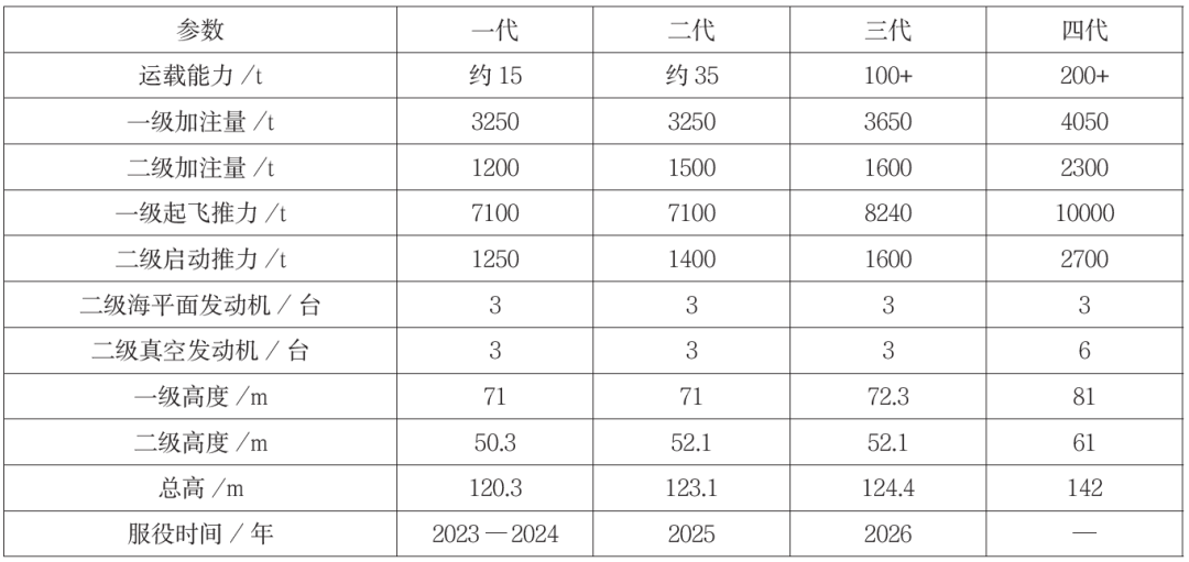 一代和二代运载能力分别为15t和35t,被定位为飞行原型验证机,后续将不再使用。三代运载能力达到百吨级,具备实用能力,计划在2026年进行首飞,预计将先用于三代“星链”(Starlink)卫星的部署,单次能够发射60颗。