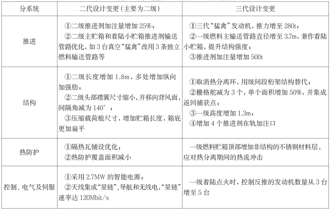 除了推进、结构和热防护的改进外,飞行试验中实现的其他改进主要包括:从冷分离方案改为热分离方案,运载能力提升10%;推力矢量控制的伺服机构从液压改为电磁驱动;增加“星链”天基测控,大幅提升数据采集量;增加二级滚转姿控推力器冗余数量;热分离后一级姿态翻转从被动控制调整为主动控制,最大程度降低推进剂消耗量等。