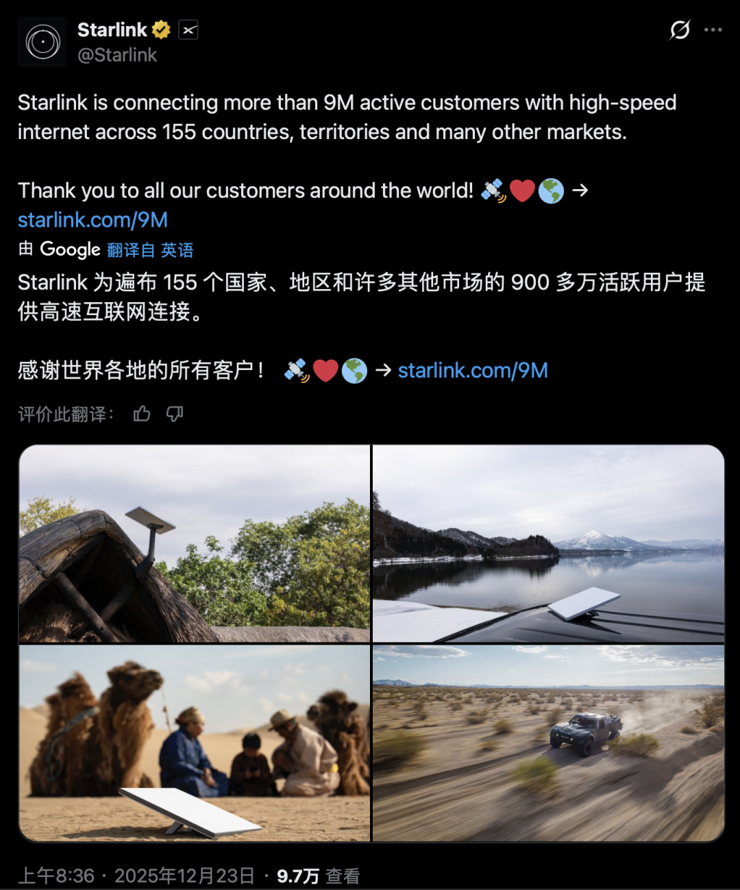 年终岁尾,星链交出漂亮成绩单。12月23日,Starlink在X平台宣布:全球活跃用户数正式突破900万,覆盖155个国家、地区和特定市场。这一数字本身已经惊艳,但更耐人寻味的,是这些用户背后实际惠及的全球人口规模——一个足以比肩中等规模国家人口的卫星互联网体系。