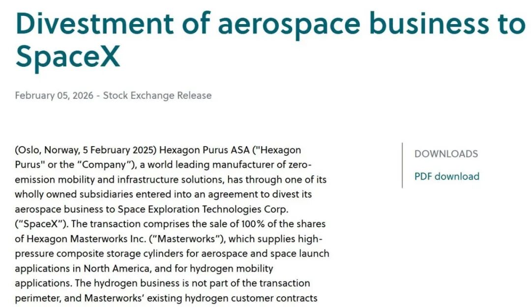 公司估值高达1.icespaceX于2026年2月5日宣布,以1500万美元收购北美高压复合材料储存罐供应商Hexagon Masterworks Inc.。该交易由挪威海克斯康普瑞斯股份有限公司(Hexagon Purus ASA)披露,涉及出售其全资子公司。这一动作在航天领域引发广泛关注,尤其对追踪星舰开发的群体而言意义重大。