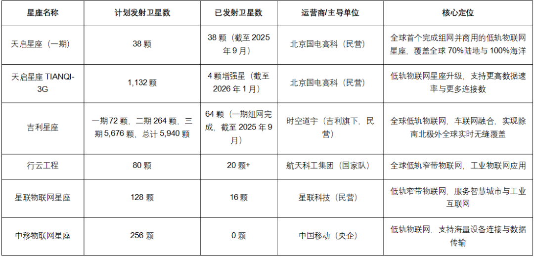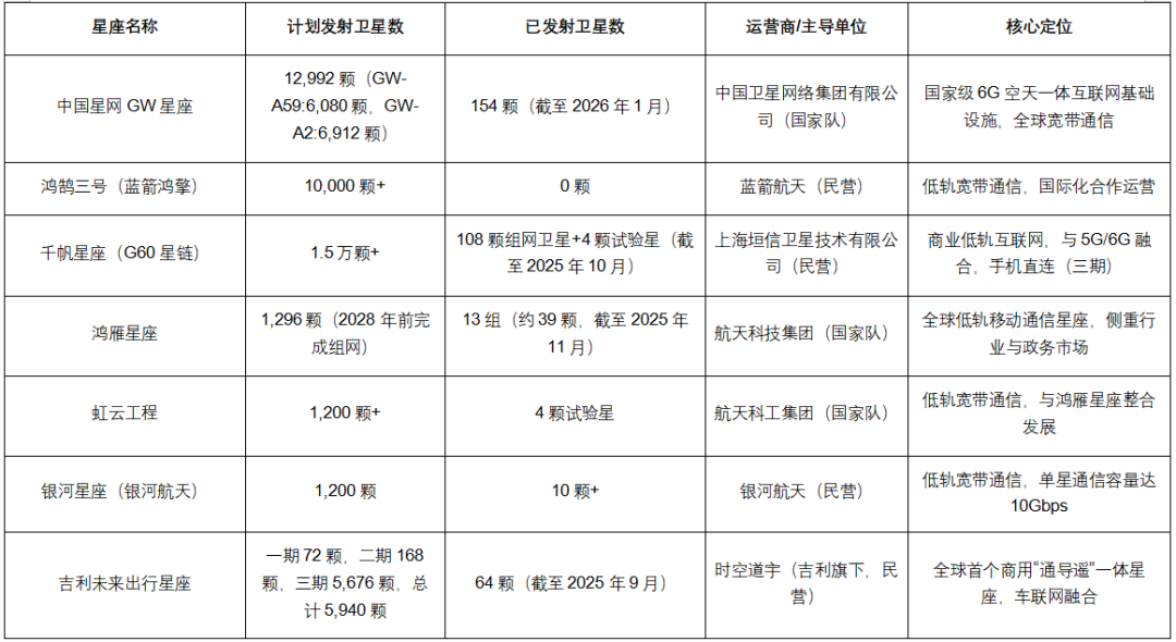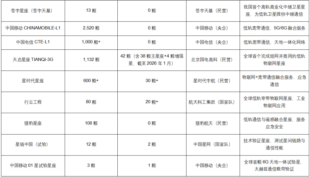 通信类星座是中国卫星星座的核心组成部分,涵盖低轨宽带、高轨中继、物联网通信等多个方向,主导单位包括国家队与民营企业,构建天地一体化通信网络,支撑6G、手机直连卫星等新技术落地,助力网络强国建设。截至2026年1月,部分星座已实现初步组网,开始提供商业服务。