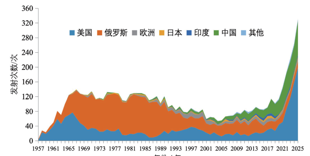 2025年,全球运载火箭发射次数继续大幅跃升,首次突破300次大关,达到330次,较2024年增长25.5%,发射质量达到3261t,较2024年增长57%,发射次数、发射质量均为1957年人类首次实施航天发射以来的最高值。截至2025年底,全球累计实施7165次发射任务。自冷战时期第一个发射高峰后,全球航天发射进入2018年以来新的高峰期,发射次数增长呈现高速、持续化的特征(图1)。
