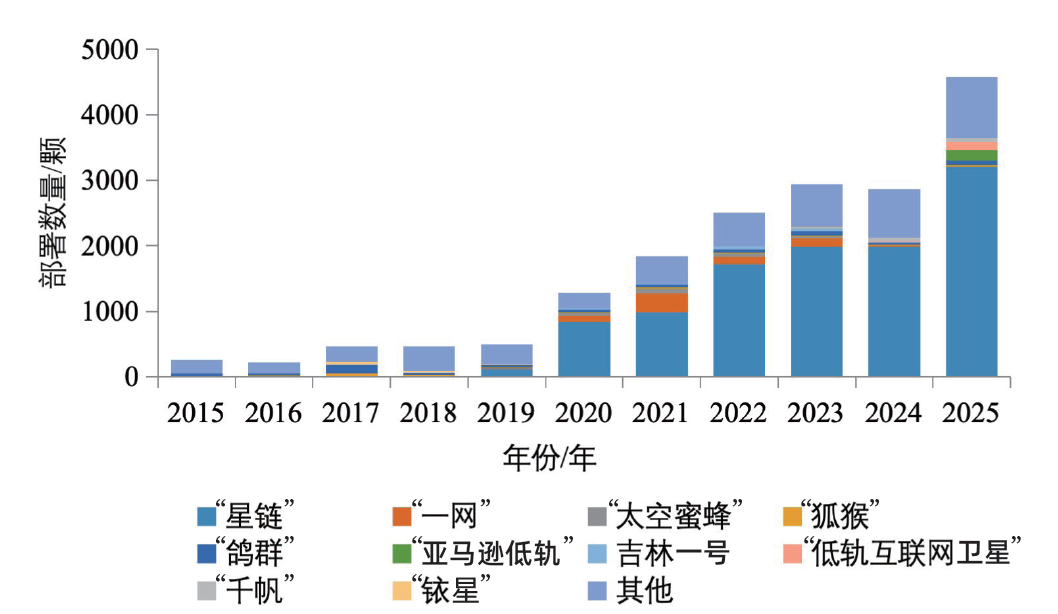 2025年,全球航天器研制发射数量达到4586颗,创历史新高。放眼长期趋势,全球航天器发射规模在过去十年间实现跨越式增长,从10年前的261颗扩大至当前水平,增长约17倍。伴随小卫星业务化应用不断深化,全球逐步掀起“轨道革命”,2013年小卫星年度发射数量首次突破100颗,此后进入快速增长通道。近十年内,“星链”(Starlink)、“一网”(OneWeb)、“鸽群”(Flock)等大型星座持续部署,其中“星链”累计部署数量已超过10000颗,“一网”“鸽群”星座累计部署超过600颗,“太空蜜蜂”(SpaceBEE)、“狐猴”(Lemur)星座累计部署超过200颗,吉林一号、“铱星”(Iridium)、“低轨互联网卫星”“千帆”等星座累计部署超过100颗(图3)。近3年来,上述星座卫星发射数量占当年全球发射总量的75%以上。此外,“狐猴”“冰眼”(ICEYE)、“开普勒”(Kepler)、“吉利”等多个星座部署规模已达数十颗,更多低轨遥感、互联网和物联网星座正陆续启动规模化部署,推动全球航天器发射数量持续攀升。