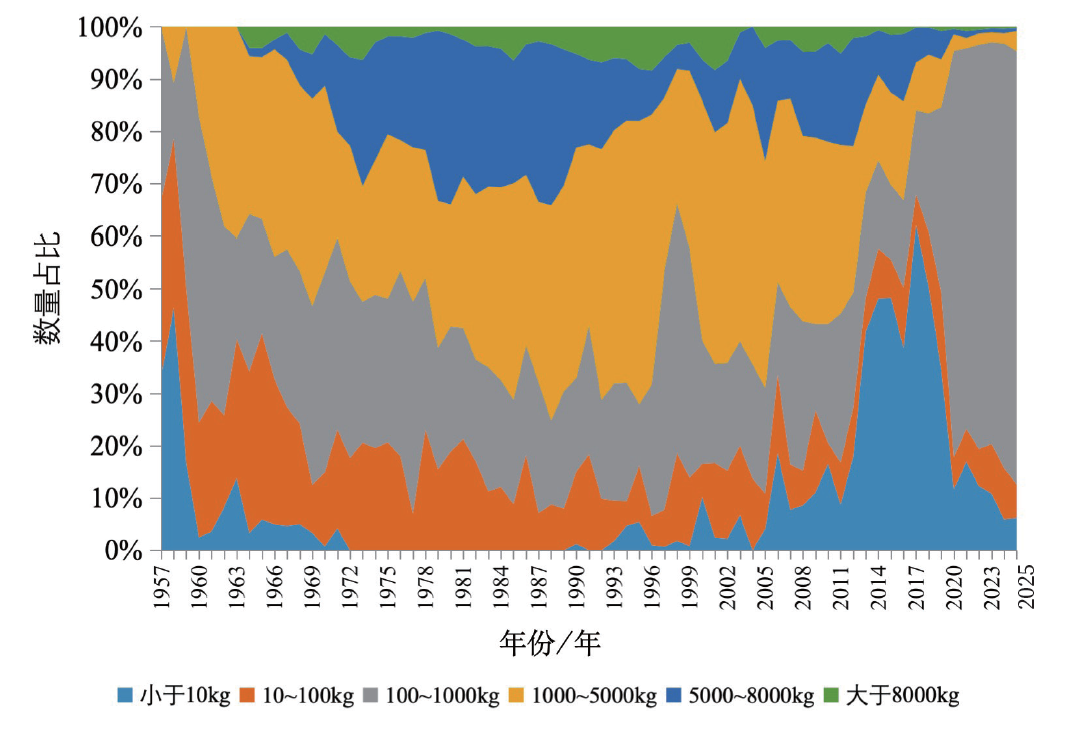 图4 各质量区间航天器数量占比变化情况