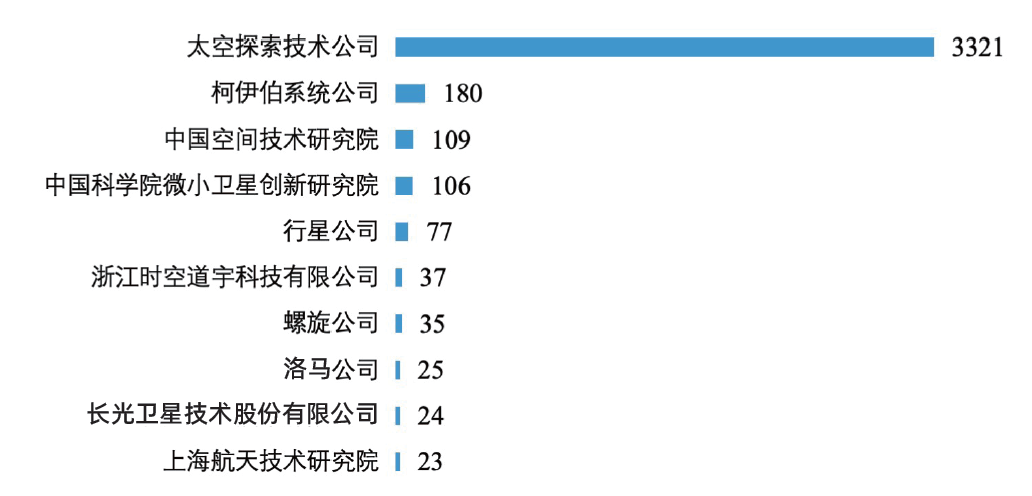 新兴宇航企业依靠宇航制造+运营服务的上下游垂直一体化集成发展模式,带动了大规模星座部署,太空探索技术公司(SpaceX)、柯伊伯系统公司(Kuiper System)、行星公司(Planet)、时空道宇公司、螺旋公司(Spire)、长光卫星技术股份有限公司分别研制了“星链”“亚马逊低轨”“鸽群”“吉利”“狐猴”、吉林一号星座卫星,凭借星座研制运营任务占据航天器研制数量前十榜单的6席。前十位仅有中国空间技术研究院、中国科学院微小卫星创新研究院、洛马公司(LM)、上海航天技术研究院4家传统宇航制造商入围,但排名和入围数量相对前3年已大幅改善,体现出传统制造商加速宇航产业化转型的态势。中国空间技术研究院首次实现年度发射破百颗(图7)。
