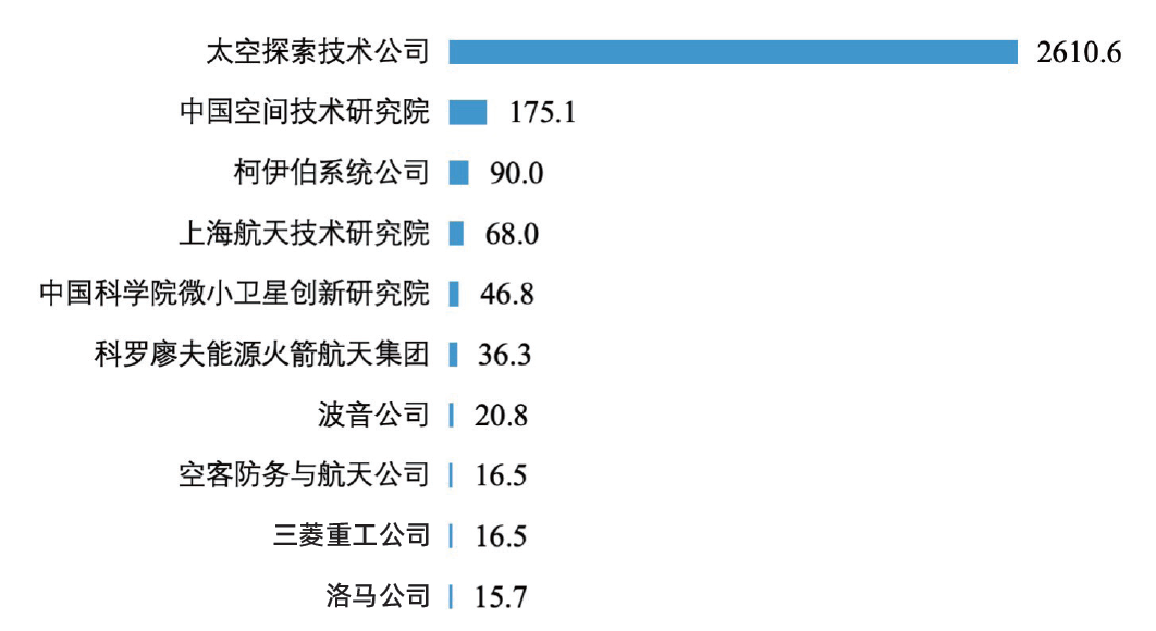 按照研制发射航天器质量排名,2025年传统宇航制造商在全球10强中占据8席,单星平均质量1.4t;新兴垂直一体化商业公司仅占2席,单星平均质量0.7t。尽管美国SpaceX公司、柯伊伯系统公司主要研制小卫星,但由于部署数量大,年研制发射航天器质量分列全球研制商第一、第三位。中国空间技术研究院、上海航天技术研究院、中国科学院微小卫星创新研究院分列全球第二、四、五位(图8)。