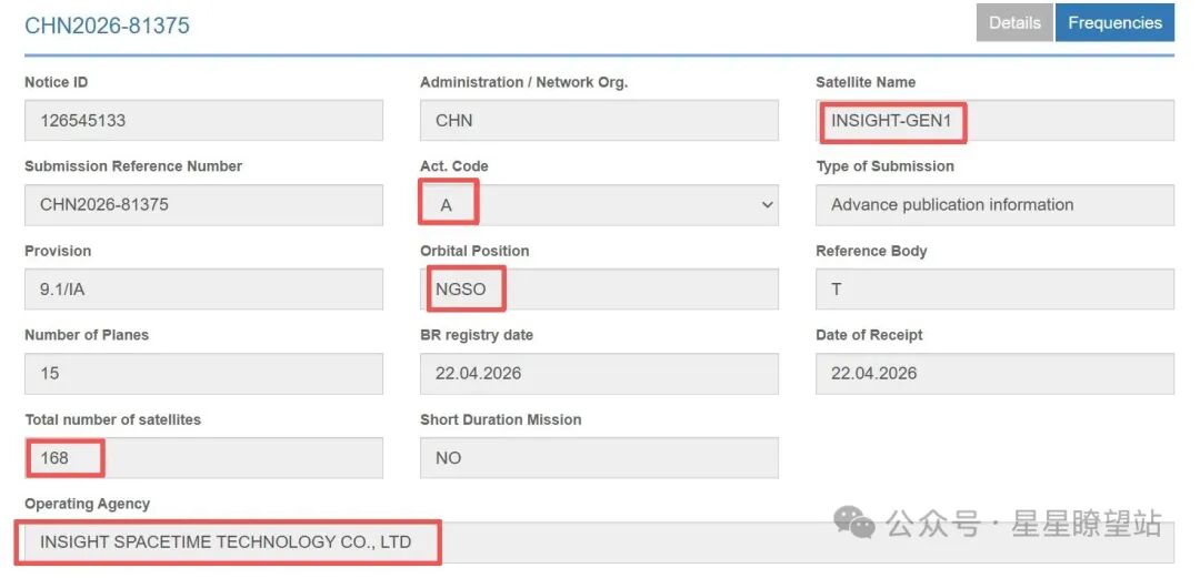 来自国际电信联盟(ITU)观官网显示,4月22日,成都的洞察时空科技有限公司(INSIGHT SPACETIME TECHNOLOGY CO., LTD)递交了一个15个轨道面,总计168颗星的非静止轨道(NGSO)遥感卫星星座的全球轨道与频谱优先权。