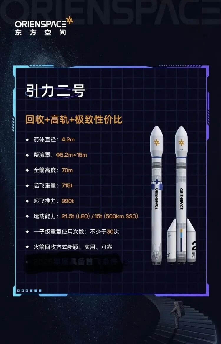 引力二号是东方空间自主研制的中大型可回收液体运载火箭,主要面向中大型卫星组网及商业高轨发射需求。该型火箭具备强劲的综合性能,其500公里太阳同步轨道(SSO)运载能力可达15吨,并拥有一箭36星的批量发射能力,可高效适配各类卫星组网及商业航天发射任务。