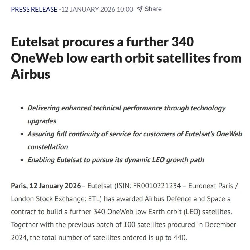 欧版 “星链” Eutelsat 周一股价涨超 9%,宣布向空客追加 340 颗 OneWeb 低轨卫星订单(总量达 440 颗),卫星技术升级且 2026 年底交付。