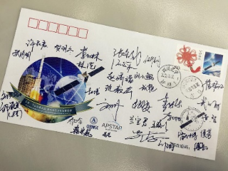 图3“亚太”九号卫星成功定点后带有发射日和定点日邮戳的项目人员签名首日封图