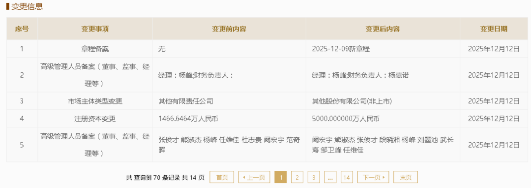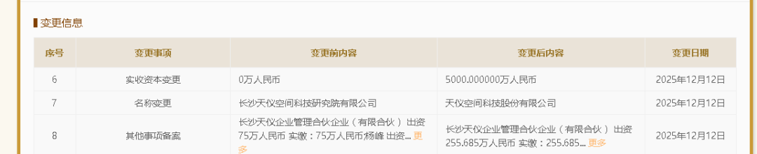 近日,来自国家企业信用信息公示系统信息显示,“长沙天仪空间科技研究院有限公司”正式完成工商变更登记,企业名称变更为“天仪空间科技股份有限公司”,公司由“其他有限责任公司”变更为“其他股份有限公司(非上市)”,注册资本由1466.65万元增加到5000万元,公司高管变更为:阙宏宇 熊淑杰 张俊才 段晓湘 杨峰 刘墨池 武长海 邹卫峰 任维佳。此次变更不仅是天仪空间企业身份与治理结构的升级,更被业内普遍视为其筹备上市进程中的关键一步,正加速迈向资本市场,开启高质量发展的新篇章。