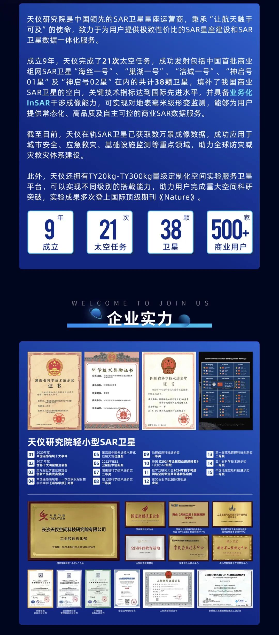 天仪空间科技股份有限公司(原长沙天仪空间科技研究院有限公司)成立于2016年,总部位于湖南长沙,是国内首个从事合成孔径雷达遥感卫星星座运营的商业公司、中国商业化SAR遥感卫星及科研卫星的开拓者和引领者。