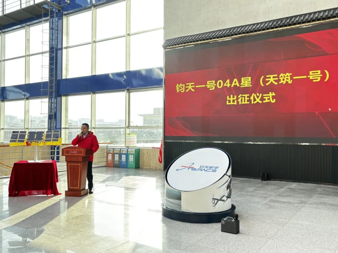 在出征仪式上,发射试验队队长张辰阳代表队员作出征宣誓,常正勇向发射试验队授予出征战旗。全体与会人员共同目送钧天一号04A星(天筑一号)转运车辆启程出征。