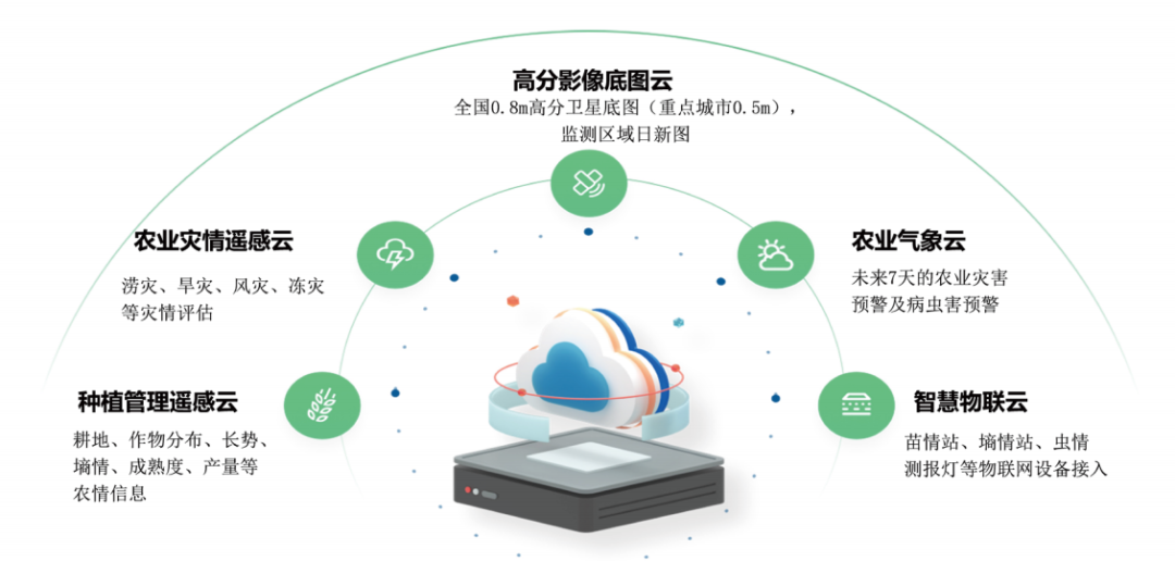 订单式农业遥感服务体系以“精准服务、按需定制”为核心理念,构建了覆盖农业生产全链条的五大核心服务模块,即“五朵云”:“高分影像底图云”通过整合多种遥感卫星资源,提供高分辨率、长时序的影像底图服务;“种植管理遥感云”提供大田种植过程中的农业资源和农情遥感监测服务;“农业灾情遥感云”提供主要农业灾害的灾情评估服务;“农业气象云”提供农业灾害的逐小时预报预警服务;“智慧物联云”提供农业“四情”(土壤墒情、作物苗情、病虫害情、自然灾害灾情)设备接入及“四情”信息实时监测服务(图2)。