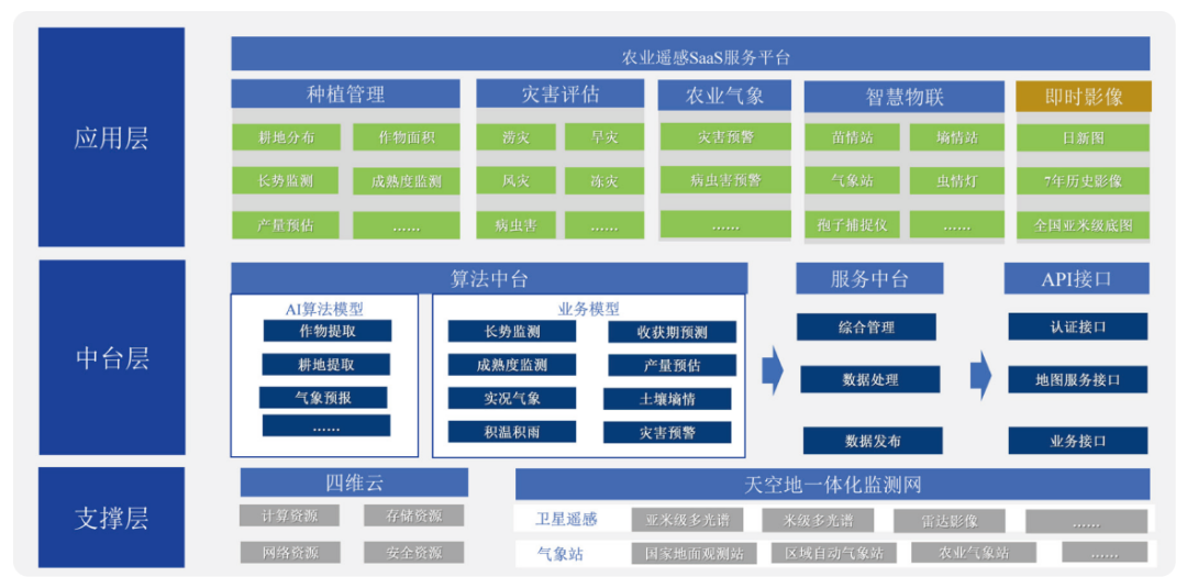 基于订单式农业遥感服务模式和服务内容的设计,面向农业生产经营者打造了“四维耘田·时空一张图”产品。该产品作为订单式农业遥感服务的创新实践,依托先进的四维云底座,整合多源遥感数据和农业业务需求,集成了即时影像、种植管理、灾害评估、农业气象、智慧物联五大专题服务,通过SaaS平台和API接口两种方式,围绕农业生产的“耕种管收”实现了从数据采集到决策支持的全链条服务(图3)。