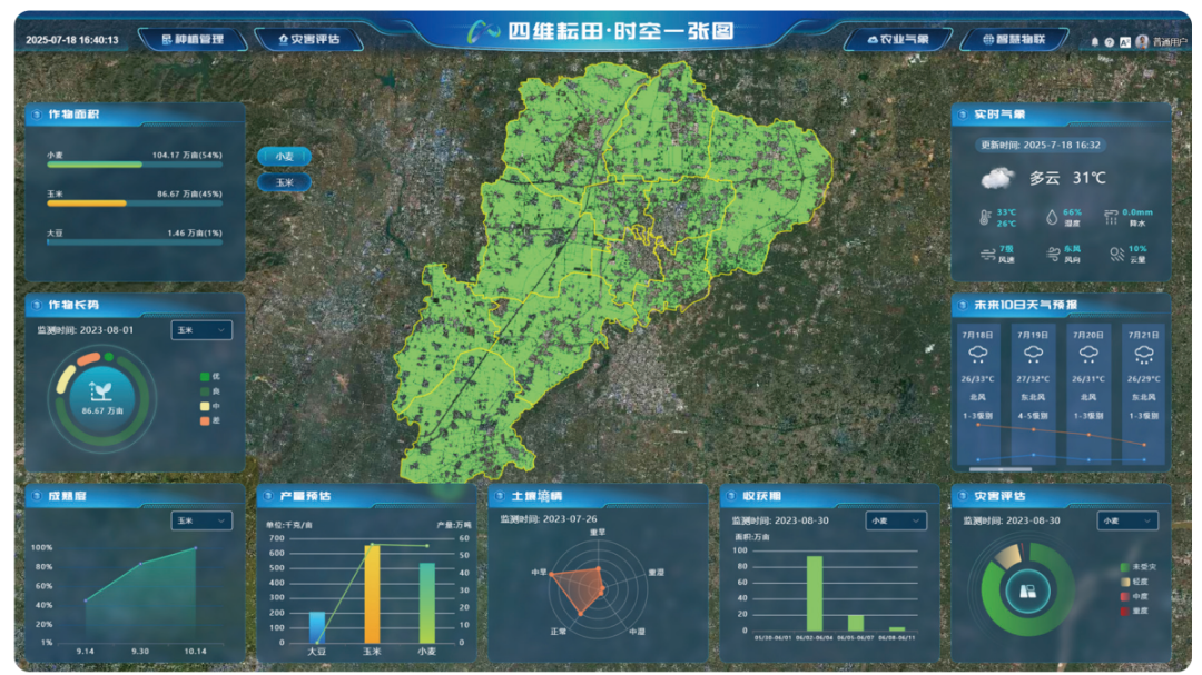 涵盖了耕地分布、作物面积、长势监测、土壤墒情、成熟度监测、收获期预测、产量预估等多个子模块,实现对农作物耕种管收全过程的精细化监测,为农业生产者提供了全方位的农情数据支持,帮助用户精准掌握农作物的生长动态,及时调整种植策略,确保农作物的健康生长和高产稳产。