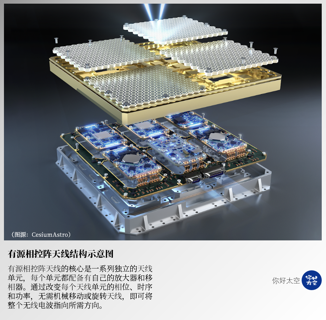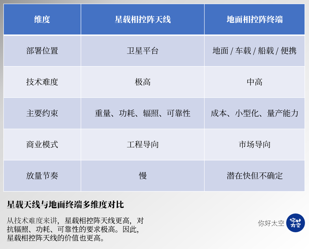 根据部署位置和工程约束的不同,它至少分为两个技术路径、商业逻辑和产业门槛完全不同的细分方向:一是星载相控阵天线,二是地面相控阵终端设备。