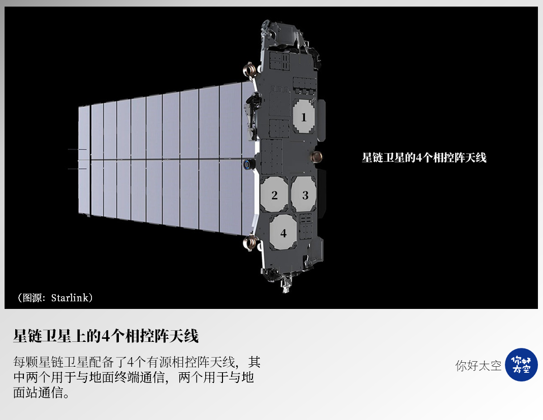 作为目前规模最大、工程节奏最快的低轨星座,每颗星链卫星配备了4个有源相控阵天线,其中两个用于与地面终端通信,两个用于与地面站通信。