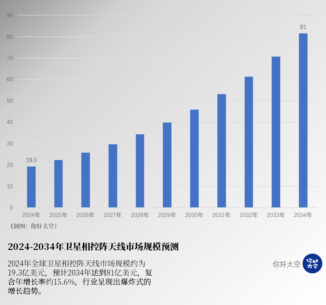 2024年全球卫星相控阵天线市场规模约为19.3亿美元,预计2034年达到81亿美元,复合年增长率约15.6%,行业呈现出爆炸式的增长趋势,增长的主要驱动因素来自于全球各国低轨宽带卫星互联网星座计划建设的不断加码。