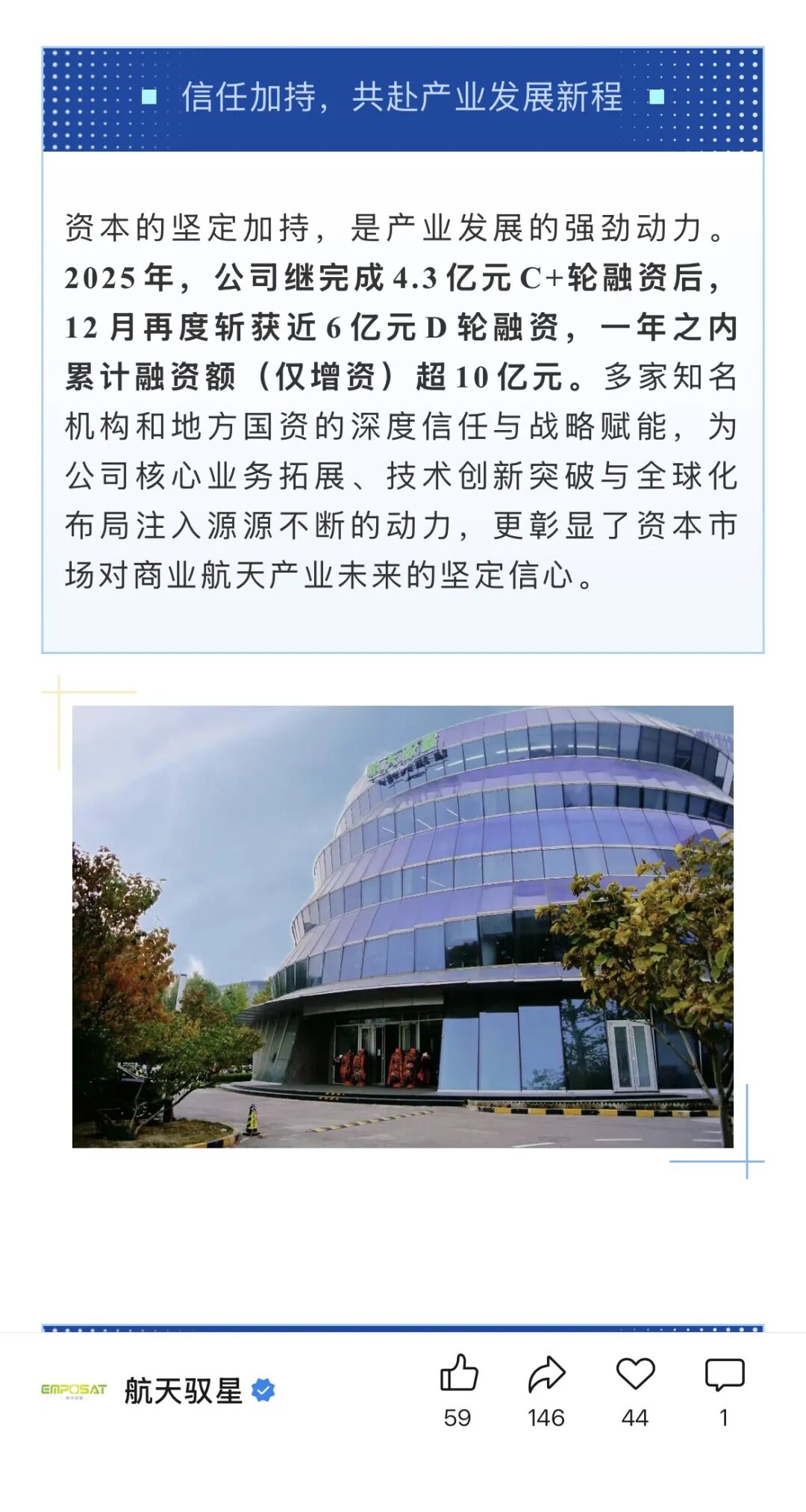 来自航天驭星官方消息,航天驭星于2025年12月获近6亿元D轮融资,加上此前完成的4.3亿元C+轮融资,公司2025年全年累计融资额(仅增资)超10亿元。