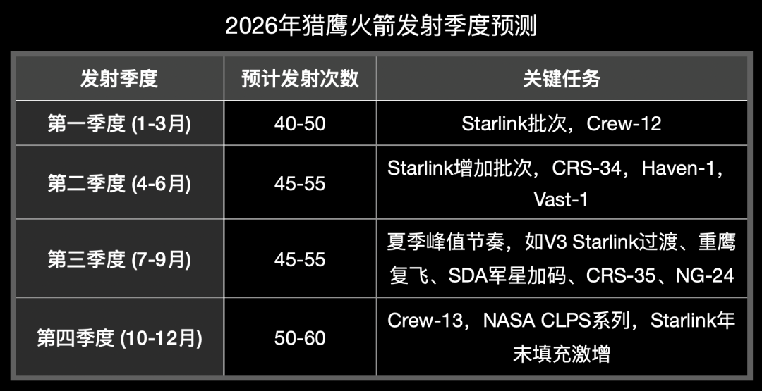 将猎鹰与星舰合并考量,2026年SpaceX年度轨道发射总量,被普遍预测在190–220次区间。在星舰进展顺利的情景下,突破200次并非小概率事件。