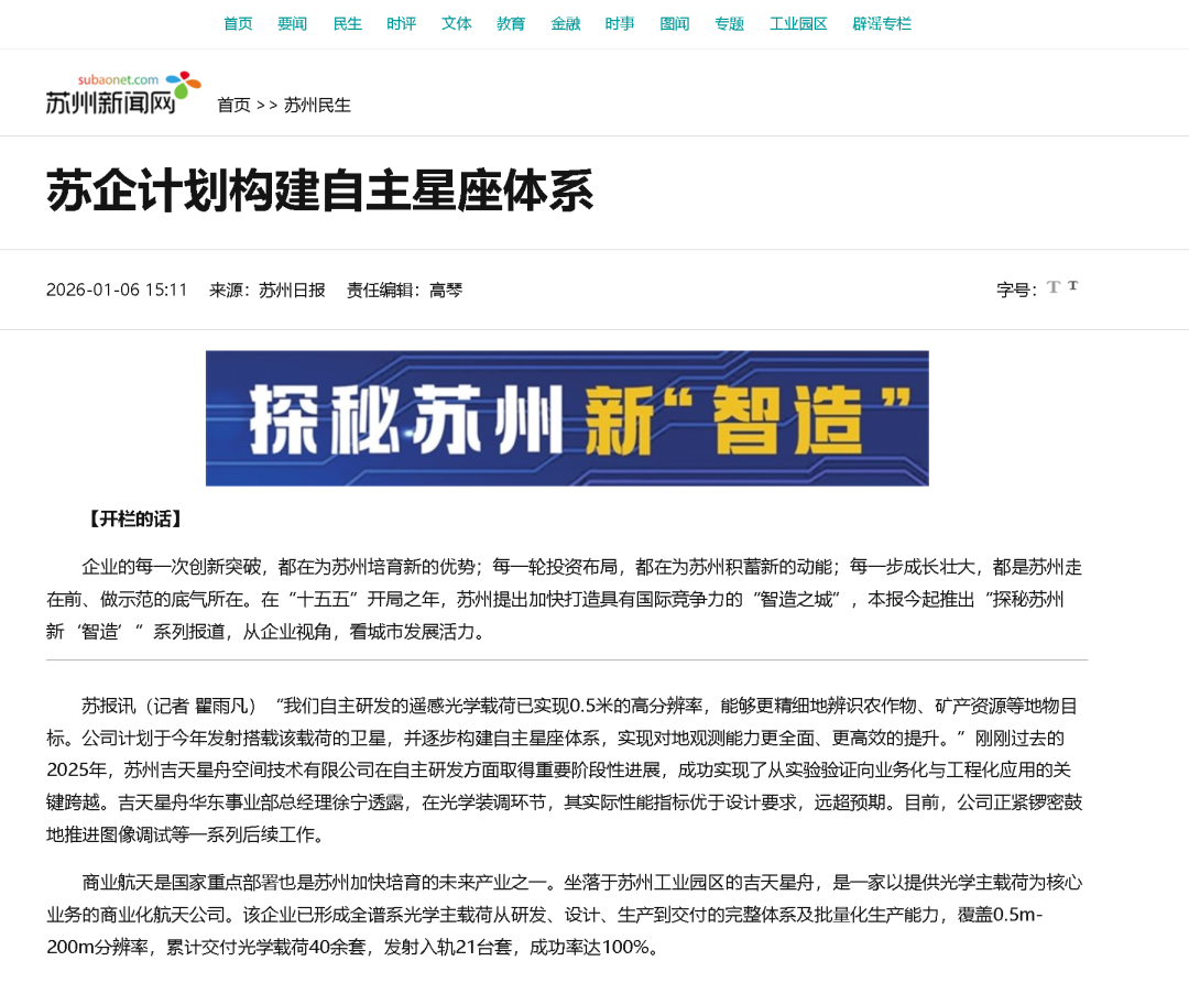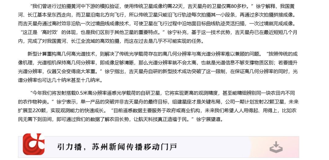 2024年,吉天星舟成功发射入轨了两颗搭载“三高”光学载荷的试验卫星——苏州一号卫星和吉林大学一号卫星,其非沿轨一次过境曲线成像技术得到在轨验证,已实现超千公里的曲线目标一次成像。截至目前,两颗卫星的在轨时间超过一年,已累计拍摄16万余景高清遥感影像,并于2024年底,获得由自然资源、水利、地质调查、气象、海洋、交通运输、农业、特种领域及科研院所、高等院校、行业协会等技术专家的一致评审认定,成为非沿轨一次过境曲线成像技术的唯一可产业化、业务化运行的卫星,达到了国际先进水平。