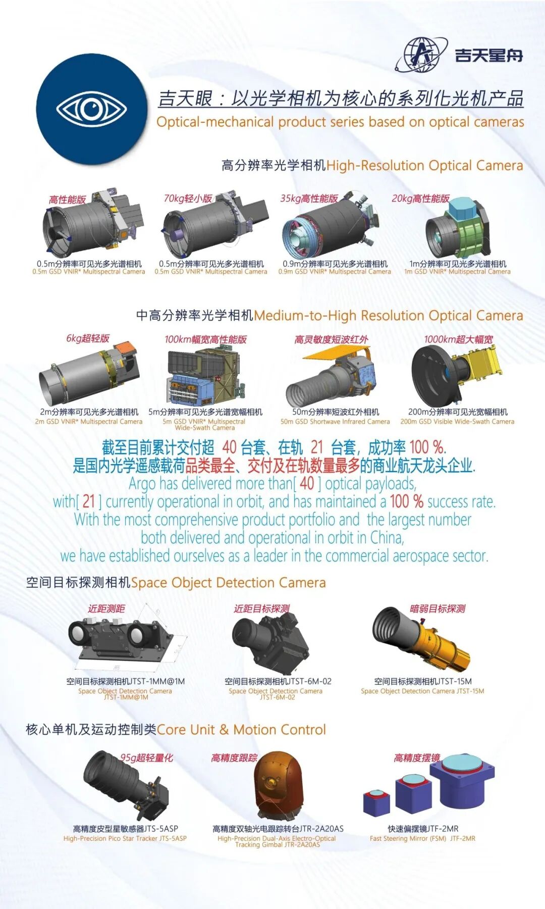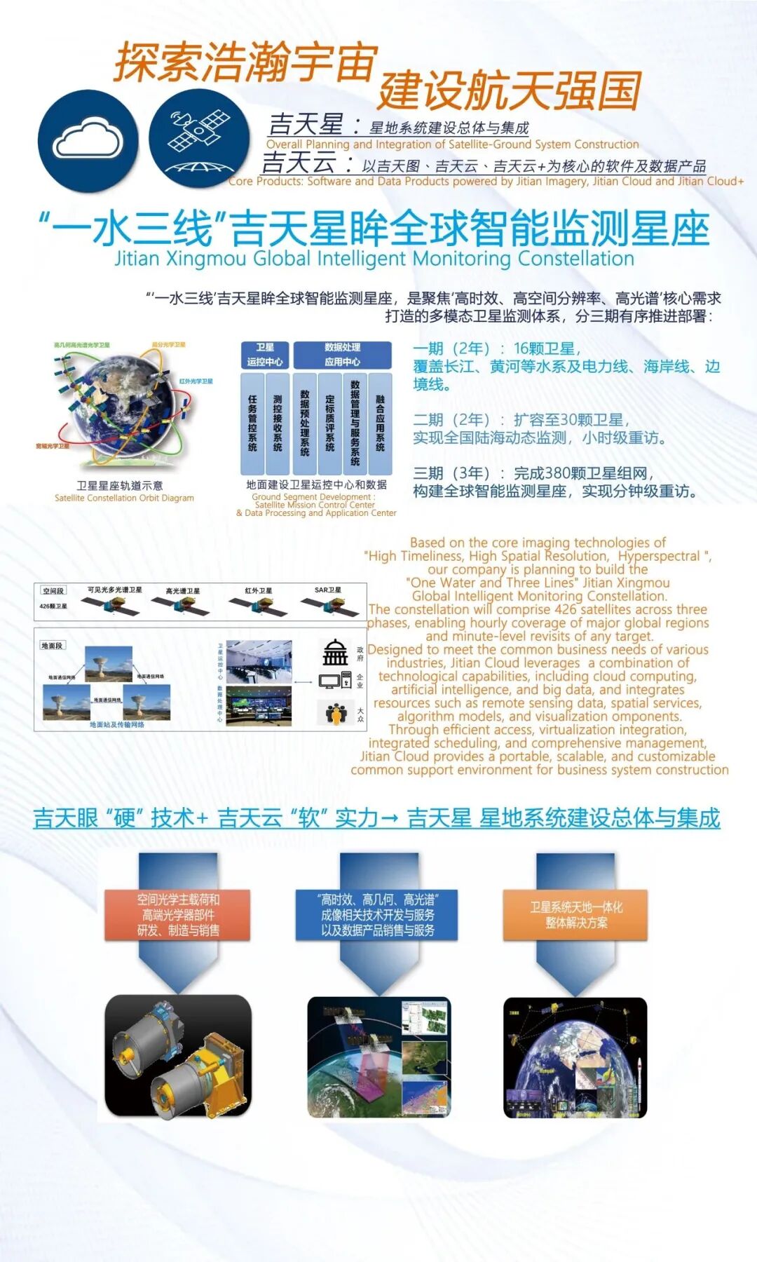 苏州吉天星舟空间技术有限公司(以下简称吉天星舟)成立于2021年6月,由中国工程院林君院士和张刘博士联合创立,是国内首家以批量化提供光学主载荷为主营业务之一的商业化航天公司。公司具备完整的空间光学遥感载荷研发、设计、生产、试验配套体系,基于自主知识产权的“高时效、高几何、高光谱”成像技术,构建满足各领域应用需求的光学载荷技术、产品体系,同时开展星座运营及数据应用服务,致力于成为全球领先的光学遥感载荷产品及服务的提供商。