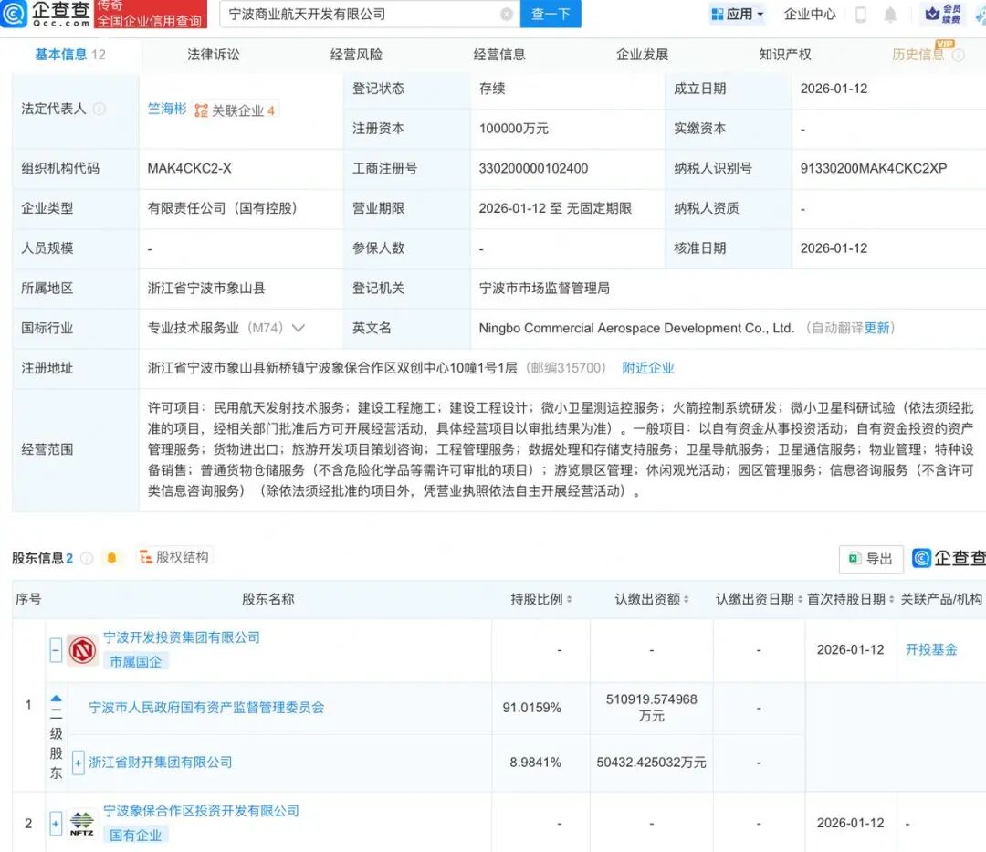 来自企查查信息显示,近日,宁波商业航天开发有限公司成立,注册资本10亿元,注册地址:浙江省宁波市象山县,经营范围包含:民用航天发射技术服务;火箭控制系统研发;微小卫星科研试验;卫星导航服务等。同时股权穿透显示,该公司由宁波开发投资集团有限公司、宁波象保合作区投资开发有限公司共同持股。