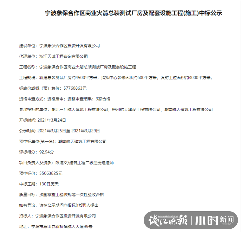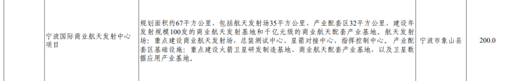 在21年,浙江省发布《浙江省重大建设项目“十四五”规划 》,规划中提到:要重点重点推进万向创新聚能城年产80G瓦时锂电池、宁波国际商业航天发射中心等项目。后续陆续也有开展商业火箭总装测试厂房建设和卫星发射中心建设等项目招标动作。但是一直未看到有后续进展信息。同时根据当《中国航天报》报道,宁波市政府与中国航天科技集团八院在20年签署了战略合作框架协议,计划在宁波航天智慧科技城建设国际商业卫星发射中心和商业航天产业园区。
