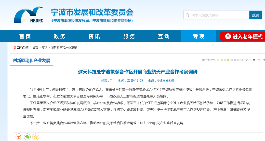 知名商业航天企业遨天科技赴宁波象保合作区开展商业航天产业合作考察调研。