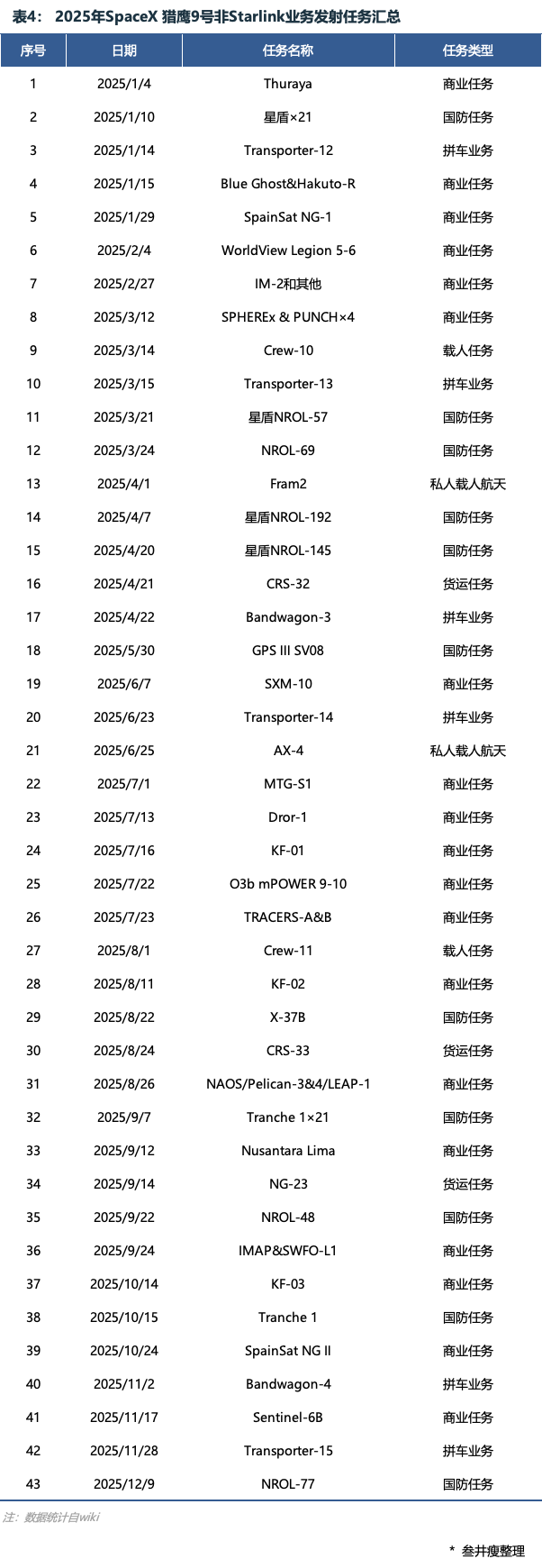 经过对2025年全年发射清单的逐一穿透与交叉验证,我们确认了这43次非Starlink任务的详细构成。