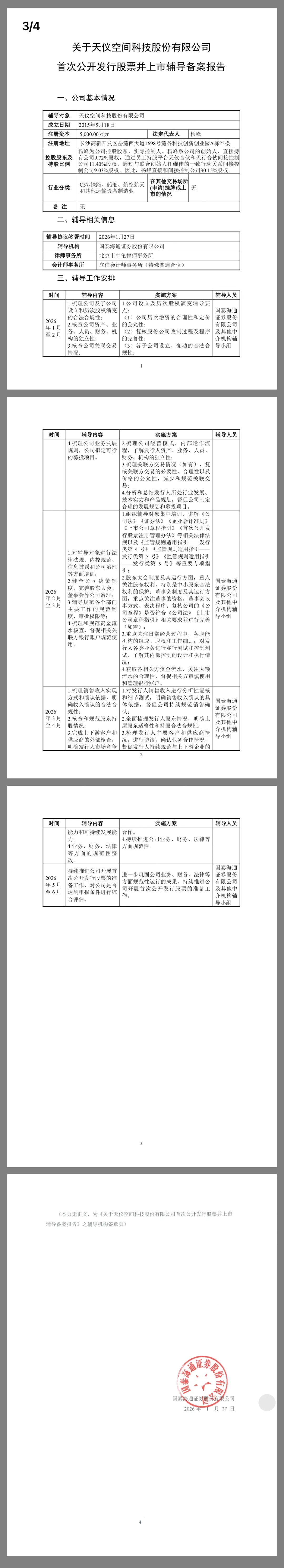 近日,来自证监会公开发行辅导公示系统显示,天仪空间科技股份有限公司(简称:天仪空间)于2026年2月2日完成IPO辅导备案,辅导机构为国泰海通证券股份有限公司,律师事务所为北京市中伦律师事务所,会计师事务所为立信会计师事务所(特殊普通合伙)。