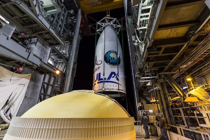 在佛罗里达州卡纳维拉尔角太空军基地,ULA(联合发射联盟)在SLC-41的垂直集成设施内,将USSF-87任务的有效载荷安装至火神火箭顶部。