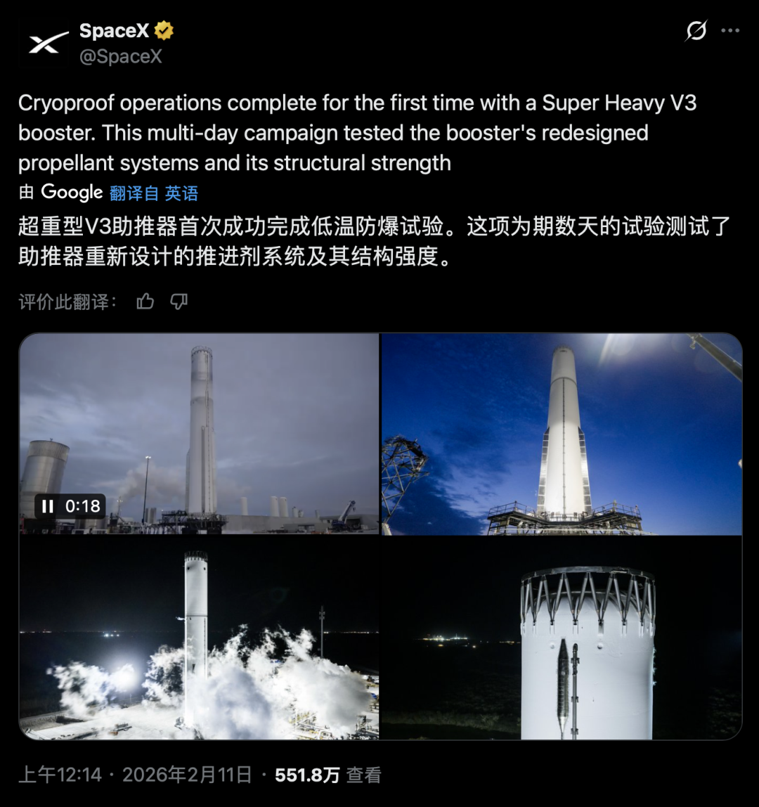 2月10日,SpaceX在X平台宣布:V3版超重型助推器首次完成低温证明测试。B19历经多轮液氮、液氧加载,模拟接近飞行压力水平,结构与推进剂系统零异常通过。这不仅抹去2025年11月B18在测试中爆裂的阴影,更意味着星舰正式迈入V3时代。