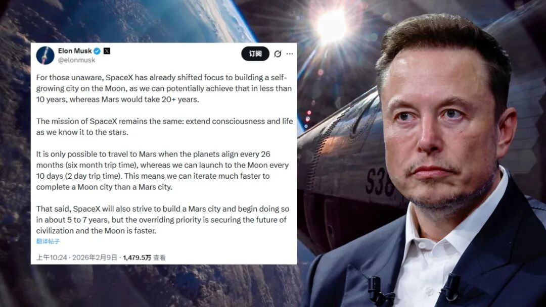 2 月 9 日马斯克宣布,SpaceX 短期重心转向月球,计划 10 年内建成自给自足月球城市,火星计划延后并将并行推进。