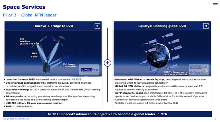 Space42在去年11月向投资者透露,公司将于2026年开始对Equatys进行实质性投入,计划资本支出为4.8亿美元,2027年将再追加1.2亿美元。与此同时,公司计划成立一家D2D服务公司,并在2026至2030年间为其注资1.5亿美元。不过,公司尚未透露2026年D2D支出的具体分配细节。