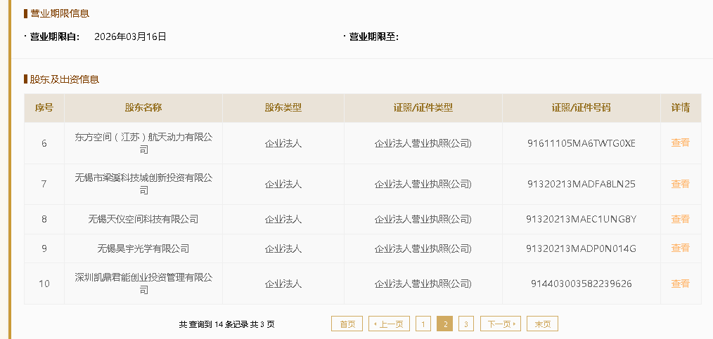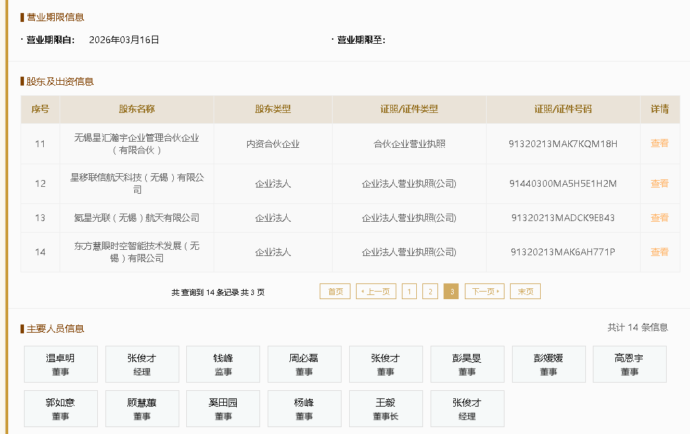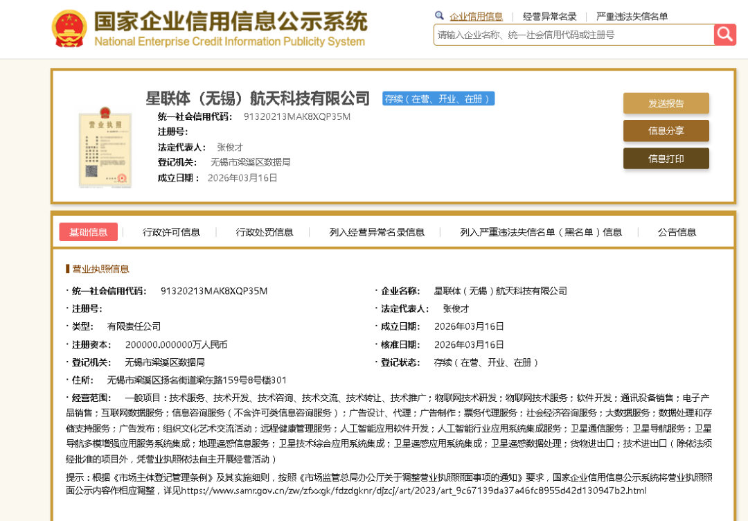 来自国家企业信用信息公示系统信息,3月16日,无锡市梁溪空天科技集团有限公司、东方空间(江苏)航天动力有限公司、无锡天仪空间科技有限公司、无锡昊宇光学有限公司、氦星光联(无锡)航天有限公司、东方慧眼时空智能技术发展(无锡)有限公司、星移联信航天科技(无锡)有限公司等携手成立星联体(无锡)航天科技有限公司。据信息显示,该公司注册资本200000万元,法定代表为张俊才,经营范围涵盖物联网技术服务、人工智能应用、卫星通信、卫星技术、卫星遥感应用等多个领域。