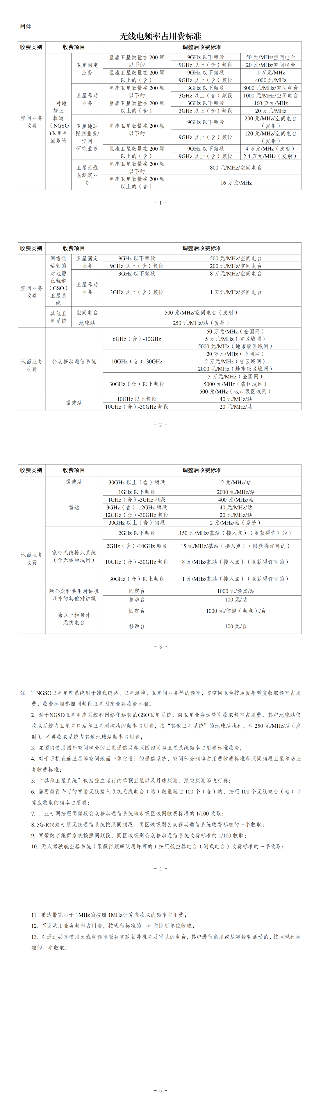 二、降低高频段收费标准。对NGSO卫星星座系统、网络化运营的GSO卫星系统、微波站、宽带无线接入系统,按照频率高低细化收费分档,部分高频段频率实行更低的收费标准。