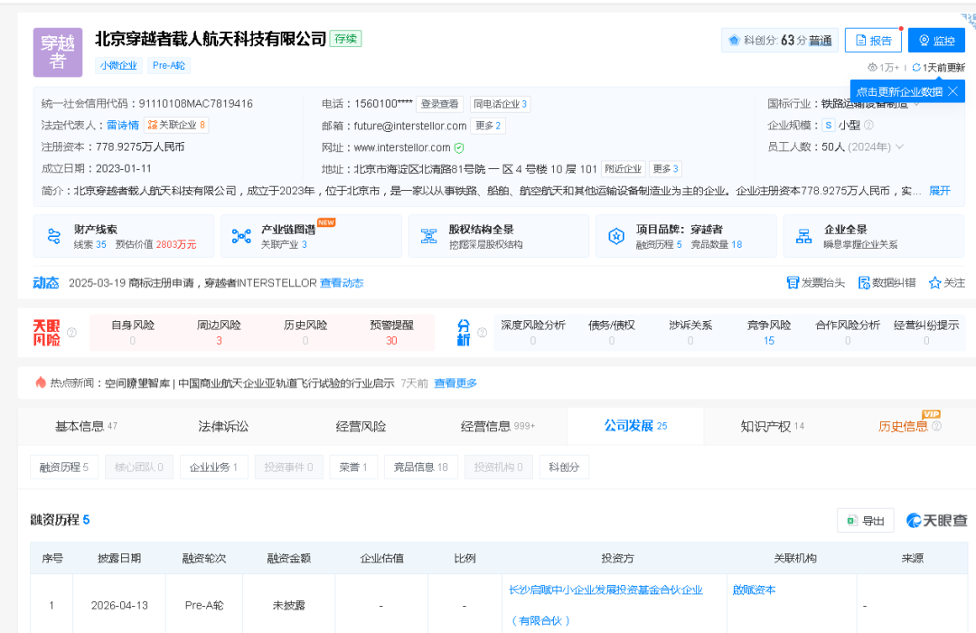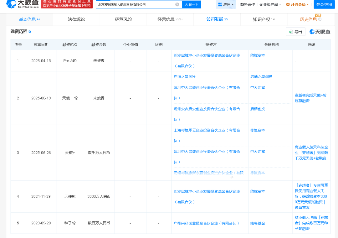 来自天眼查信息显示,北京穿越者载人航天科技有限公司(简称“穿越者”)近日完成新一轮融资。本轮融资由长沙启赋中小企业发展投资基金合伙企业(有限合伙)(简称“啟赋资本”)追加投资,本次融资金额尚未公布。啟赋资本曾于2024年独家完成对穿越者的3000万元人民币天使轮投资。